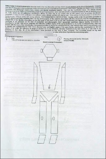 - اطلاعات اضافی برای شناسایی هویت: شامل هر نام ( به غیر از نام قانونی میزبان) که قبلاً توسط میزبان استفاده شده است ، از جمله نام خدمتکار میزبان ، نام مستعار ، نام مستعار ، نام مرحله یا نام حرفه ای. یک کپی سخت خوانا یا کپی الکترونیکی قابل خواندن و یا یک نسخه الکترونیکی دیگر از یک کپی سخت از شناسنامه مورد بررسی قرار گرفته ، و در صورت عدم وجود یک تصویر جدید و قابل تشخیص از میزبان ، یک نسخه قابل خواندن از کارت شناسایی تصویر (مانند این اصطلاح در زیر تعریف شده است)؛ یک کپی از تصویر (از جمله دوربین های زنده یا تبلیغات) و در جایی که این تصویر در یک سایت یا سرویس رایانه اینترنتی منتشر شده است ، یک نسخه از هر آدرس اینترنتی مرتبط با تصویر. اگر هیچ نشانی اینترنتی با تصویر همراه نباشد ، سوابق باید یک مرجع شناسایی منحصر به فرد دیگر را که مربوط به محل نمایش در اینترنت است ، درج کنند. و برای هر میزبان در یک تصویر که بصورت زنده در اینترنت انجام می شود ، کپی از تصویر با زمان اجرا کافی برای شناسایی مجری در تصویر و برای پیوند دادن مجری با سوابق مورد نیاز برای تأیید سن خود.